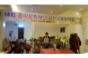 연수 후기 게시물 검색 검색대상 제목 내용 제목+내용 검색어 필수 사랑의친구들, 종이나라, 종이문화재단 2… 사랑의친구들, 종이나라, 종이문화재단2017 설 명절 맞아 독거노인, 장애인 등 소외계층 이웃을 위한 ‘사랑의 떡국 나누기’ 사랑의친구들(회장 김성재)과 종이나라(회장 정도헌)이 설 명절을 맞아 독거노인, 장애인 등 소외계층 이웃을 위해 떡국선물세트 100개(300만원 상당)를 서울 중구청(구청장 최창식)에 기탁했다. 1월 19일(목) 오전, 서울 정동제일교회에서 ‘사랑의 친구들’ 이희호 명예회장과 종이문화재단 조이봉사단(단장 송요선, 김연환, 최혜윤 위원), 이준서 사무처장등이 성금 모금에 참여한 여러 후원자, 자원봉사자들과 함께 사랑을 담아 3000개의 떡국 재료를 정성껏 바구니에 포장하며 많은 이들이 따뜻한 설을 보낼 수 있도록 힘을 쏟았다. 종이문화재단 조이봉사단은 종이나라 강주도 상무와 종이문화재단 이준서 사무처장과 함께 서울 중구청을 방문해 정성껏 포장한 떡국선물세트를 최창식 서울중구청장에게 직접 전달했다. (사)사랑의 친구들(회장 김성재)이 주최하고 종이나라를 비롯 40여 기업, 종이문화재단 등 후원단체와 개인 후원자들이 참여하는 「사랑의 떡국 나누기」행사는 1998년부터 열고 있는 행사로, 전국 2800곳, 독거노인 및 조손가정에 2000년부터 매년 설 명절을 앞두고 실시해왔다. ‘사랑의 친구들’이 준비하는 떡국 바구니는 떡국 떡과 쇠고기, 멸치 등 떡국을 끓이는 데 필요한 재료가 세트로 알맞게 구성되어있다. 사랑의친구들 김성재 회장은 “사랑이란 작은 것을 나누는 것에서부터 시작된다는 걸 아는 것이 중요하다”라고 강조하면서 “주변에 있는 어려운 이들에게 내미는 작은 손길 하나가 큰 기적을 이룬다는 생각을 갖고 외로운 독거노인, 소년소녀가장에게 사랑의 손길을 나눠준다면 기쁨과 행복으로 보다 밝고 희망찬 사회가 되길 바란다.” 라고 전했다. 글쓴이: 최고관리자 2017-01-26 종이문화재단 2016년 겨울방학 교원특수… ‘초등교과와 연계한 창의쑥쑥 종이접기(기초)’ 종이문화재단 2016년 겨울방학 교원특수분야직무연수 성황리에 마쳐 종이문화재단 평생교육원(원장 김영만)이 겨울방학을 맞아 초ㆍ중등 교사들의 교과운영 전문성을 강화하기 위해 실시한 맞춤형 특수분야 직무연수를 운영하고 지난 1월 13일 마무리 되었다. 이 연수는 종이문화재단이 서울시 특수분야 연수기관으로 지정받아 서울 및 전국 초ㆍ중등 교원들을 대상으로 지난 1월 2일~1월 6일, 1월 9일 ~ 1월13일까지 2주간 종이문화재단평생교육원 강의실에서 실시됐다. 본 연수과정은 ‘초등교과와 연계한 창의쑥쑥 종이접기(기초ㆍ심화)’와 ‘교과와 함께하는 북아트(기초)’가 운영되었다. 1월 6일과 13일, 김영만 원장이 이들 교사들을 대상으로 종이접기로 아이들과 소통과 공감을 나눌 수 있는 종이접기 특강을 펼쳤다. 참여한 교원들은 5일 동안 진행된 프로그램을 이수하고 30시간의 연수이수학점(2학점)과 이수증을 부여받았으며, ‘종이접기영재지도사 2급(기초), 1급(심화)’, ‘북아트지도사 2급’ 자격증도 취득했다. 서울당서초등학교 주은경 교사는 “이번 연수를 통해 종이접기는 아이들의 창의적 사고력을 신장시켜주고 더 나아가 자기주도적 학습을 할 수 있는 계기를 마련해 준다는 점에서 종이접기 활동의 교육적 가치를 다시금 깨닫게 됐다.”고 말했다. 서울정민학교 이유림 교사는 “북아트 연수를 듣고 학생들과 수업할 때 다양한 교과에서 북아트 기법을 활용해 볼 수 있겠다는 기대가 크다.”고 소감을 밝혔다. ‘초등교과와 연계한 창의쑥쑥 종이접기(심화)’ ‘교과와 함께하는 북아트(기초)‘ ‘김영만 종이문화재단 평생교육원장 특강’ 글쓴이: 최고관리자 2017-01-16 경기화성 롯데캐슬 알바트로스 경로당(북카… 글쓴이: 최고관리자 2017-01-10 노영혜 이사장, 연합뉴스 매거진 『연합 … 노영혜 이사장, 연합뉴스 매거진 『연합 이매진』 에서“종이접기로 한민족 종이문화 세계화에 앞장” 인터뷰 종이문화재단 세계종이접기연합 노영혜 이사장이 국가기간뉴스통신사 연합뉴스 매거진 『연합 이매진』 2017년 1월호에 소개됐다. 『연합 이매진』의 임형두 기자와 전수영 사진기자는 지난 12월 13일, 종이문화재단을 방문, 노영혜 이사장을 인터뷰 했다. 본지 4페이지(164~167p)에 소개된 글에는 “유구한 전통 종이접기와 우수한 종이문화의 계승과 발전, 세계화를 위해 앞장서오고, 홍익이념이 담긴 고깔을 통해 한민족의 일체화와 남북화해, 분단 극복을 꾀하고 있다” 는 노 이사장의 이념과 앞으로의 꿈을 담았다. 노 이사장은 인터뷰 말미에 “우리가 주최하는 종이문화 행사에서 가장 많이 등장하는 용어가 ‘조이’랍니다. ‘조이’는 종이의 옛말이지요. 종이를 만드는 닥나무의 한자음 저(楮)의 발음이 저이-> 조이-> 종이로 변해 왔는데 종이의 옛말 ‘조이’는 기쁘고 즐겁다는 영어의 ‘JOY’와 발음이 같아요. 종이접기를 하면 모두가 기쁘고 즐겁고 행복해진다는 뜻으로 종이접기를 시작할 때나 완성했을 때 또는 관련 행사에서 ”종이문화로 세계화