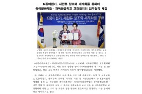 연수 후기 게시물 검색 검색대상 제목 내용 제목+내용 검색어 필수 경기일산동구강촌종이문화교육원 설립 경기일산동구강촌종이문화교육원 설립■ 경기일산동구강촌종이문화교육원 정혜원 교육원장: 010-7300-8731■ 주 소: 경기 고양시 일산동구 강송로 197 강촌마을8단지 상가 1층 115호 정혜원 교육원장이 5월 30일(목), 경기일산동구강촌종이문화교육원(재단법인 종이문화재단·세계종이접기연합)을 설립했다. 글쓴이: 최고관리자 2024-05-30 2024 (주)종이나라 은탑산업훈장 수상 [인터뷰365] ☞ https://buly.kr/7QK1iN6 글쓴이: 최고관리자 2024-05-30 종이문화재단, 재영한글학교협의회와 업무협… K종이접기, 새한류 창조와 세계화를 위하여종이문화재단·재영한글학교협의회 업무협약 체결△ 노영혜 (재)종이문화재단·세계종이접기연합 이사장과 정경선(왼쪽) 재영한글학교협의회 회장이 K종이접기 새 한류 창조와 재영한글학교 교수학습 개발 및 청소년 캠프와 교사연수 등 상호 협력 발전을 위해 업무협약을 체결했다. / 2024. 5. 28 [사진: 재단법인 종이문화재단 제공](재)종이문화재단·세계종이접기연합(이사장 노영혜)과 재영한글학교협의회(회장 정경선)가 5월 28일(화) 11시, 서울 중구 장충동 종이나라박물관에서 K종이접기와 재영한글학교 프로그램 개발 등 유기적인 협력과 상호 발전을 위하여 업무협약(MOU)을 체결했다.두 기관은 △ 재영한글학교 교수 학습 프로그램 공동개발·운영 및 상호교류 △ K종이접기, 종이문화 분야별 자격증 과정 및 작품공모대회 등 재영한글학교의 한국어 교육에 연계될 수 있는 사업 협력 △ 청소년 캠프와 교사 연수 등 재영한글학교협의회와 협업 △ 기타 양 기관의 공동 발전에 필요하다고 인정되는 사항 등에서 상호 협력하기로 했다.업무협약 체결식에는 노영혜 이사장, 정경선 회장과 함께 김봉섭 「한글의 최전선, 지구촌 한글학교 스토리」 책 저자, 한상인 우리문화세계로 대표, 이형호 (재)한지살리기재단 상임이사, 최현사 (재)한지살리기재단 이사, 김영순 대한민국 종이접기 명인, 지영헌 (재)종이문화재단 교육전문위원, 김영일 (재)종이문화재단 사무국장, 박병식 ㈜종이나라 경영지원실 상무, 신재민 ㈜종이나라 해외사업본부 상무가 참석하여 힘을 모았다.노영혜 이사장은 “K종이접기는 두뇌 개발, 창의인성교육과 한글 교육은 물론 수학·과학·예술·산업으로 발전되고 있다. 재영한글학교협의회와의 협력과 협업을 통하여 K종이접기가 새 한류 창조, 세계화에 기여하고, 재영한글학교의 교육프로그램의 다양화로 K컬쳐가 확산되어 우리나라의 통일과 세계 평화에 이바지 되기를 바란다.”고 말했다.정경선 회장은 “K종이접기를 활용한 교수 학습 프로그램이 재영한글학교 셀제 교실 현장에서 사용되는 활동이 되도록 공동 개발하고 종이문화재단과 협업하여 K종이접기의 사업이 한국어 교육에 연계될 수 있는 K-Culture로 발전될 수 있도록 협력하겠다.”는 의지를 밝혔다.△ 노영혜 (재)종이문화재단·세계종이접기연합 이사장(앞줄 오른쪽)과 정경선(왼쪽) 재영한글학교협의회 회장이 업무협약을 한 뒤 관계자들과 기념 촬영하고 있다. 사진 뒷줄 왼쪽부터 지영헌 종이문화재단 교육전문위원, 박병식 종이나라 경영지원실 상무, 신재민 종이나라 해외사업본부 상무, 김봉섭 「한글의 최전선, 지구촌 한글학교 스토리」책 저자, 김영순 대한민국 종이접기 명인, 한상인 우리문화 세계로 대표, 이형호 한지살리기재단 상임이사, 최현사 한지살리기재단 이사, 김영일 종이문화재단 사무국장 / 2024. 5. 28 [사진: 종이문화재단 제공][연합뉴스] ☞ https://shorturl.at/a23GH[연합뉴스] ☞ https://shorturl.at/if7CH[월드코리안뉴스] ☞ https://shorturl.at/4CeBY 글쓴이: 최고관리자 2024-05-29 김영만 원장(재단법인 종이문화재단 평생교… 김영만 원장(재단법인 종이문화재단 평생교육원)의 활동 소식 TV조선 '피플 퍼레이드' 유튜브 영상 캡처 화면 [TV조선 '피플 퍼레이드'] ☞ https://youtu.be/01mYTm67PWs?si=mToLJBB8ZFJzVmMx4월 26일(금) [서울경제] ☞ https://n.news.naver.com/article/011/00043335554월 29일(일) MBC라디오 '지금은 라디오 시대' 생방송☞ https://playvod.imbc.com/player/index.html?itemid=1501079&broadcastid=1000669108920100000&mediaType=VOD5월 03일(금) CBS라디오 '박재홍의 한 판 승부' 오후 7시 생방송☞ https://www.nocutnews.co.kr/news/6140087?utm_source=naver&utm_medium=article&utm_campaign=202405040831075월 05일(토) JTBC 주말 뉴스룸 오후 8시 방송☞ https://news.jtbc.co.kr/article/article.aspx?news_id=NB121947895월 06일(월) KBS라디오 '황정민의 뮤직쇼' 오후 3시 방송☞ https://www.instagram.com/p/C6nmvIUyL3O/?utm_source=ig_web_copy_link&igsh=MzRlODBiNWFlZA==5월 06일(월) MBC 뉴스데스크☞ https://imnews.imbc.com/replay/2024/nwdesk/article/6595568_36515.html5월 06일(월) [한국경제] ☞ https://www.hankyung.com/article/20240506907415월 07일(화) KBS라디오 '임수민의 지금 이 사람' 오후 3시 1편 방송, 9시 재방송☞ https://vod.kbs.co.kr/popup.html?source=episode&sname=vod&stype=vod&program_code=R2023-0184&program_id=PS-2024079940-01-000&broadcast_complete_yn=N&local_station_code=00&auto_play=on5월 08일(수) KBS라디오 '임수민의 지금 이 사람' 오후 3시 2편 방송, 9시 재방송☞ https:/