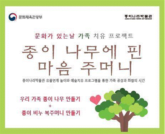 서울 장충동의 종이나라박물관(관장 노영혜)은 4월부터 11월까지 매월 마지막 주에 가족 치유 프로젝트로 '종이 나무에 핀 마음 주머니'를 운영한다고 21일 밝혔다.