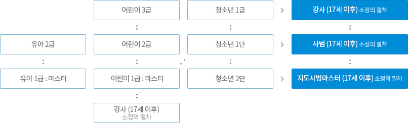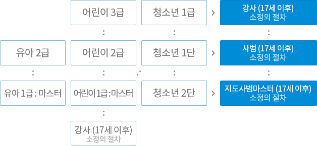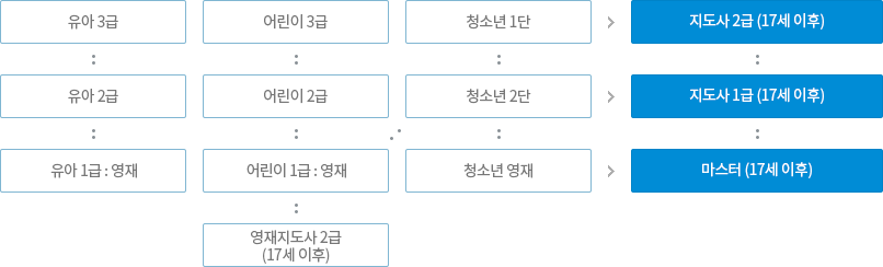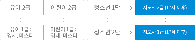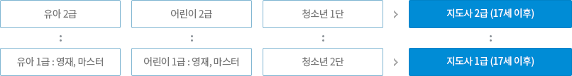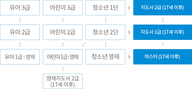 | 영역 | 유아 3급 | 유아 2급 | 유아 1급 | 어린이 3급 | 어린이 2급 | 어린이 1급 | 어린이 마스터 | 청소년 1급 | 청소년 1단 | 청소년 2단 | 청소년 영재 | 청소년 마스터 |